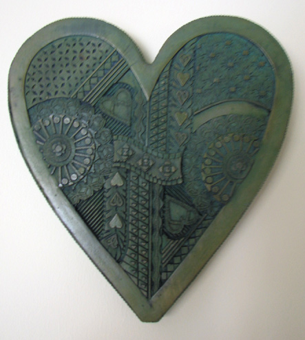 Linda Thorson of Seattle. These are cast using architectural detail concrete and can be hung outside or inside. I loved the detail and I always love hearts. Couldn't decide whether to put it inside or outside and finally decided to hang it inside where I can see it more often. I hung it next to the Goines poster. I like the way they speak to each other, both the color and how the heart shape echos the shape of the leaves in the poster. I think I need something else to hang with them. I'm sure I have something around here!