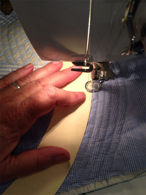 Deciding how to quilt a piece is always an interesting puzzle. I don't mark my quilting lines or draw them out ahead of time. I generally just look at the piece, get a feel for what I think will look best and then free-motion away. When I got to the open sky above the clouds I continued the curved lines, but found I was having a hard time getting them consistent enough in the larger area. I got one section done and it looked so awful I pulled out the seam ripper and spent another hour un-sewing again. Then I remembered having had this problem once before. Cutting a little cardboard template had worked well, and it worked again today.
